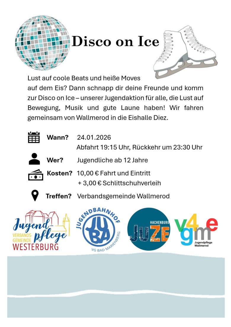 Lust auf coole Beats und heiße Moves auf dem Eis? Dann schnapp dir deine Freunde und komm zur Disco on Ice – unserer Jugendaktion für alle, die Lust auf Bewegung, Musik und gute Laune haben! Wir fahren gemeinsam von Wallmerod in die Eishalle Diez.