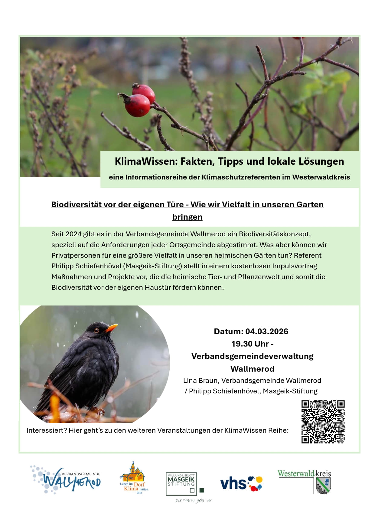 Am 04.03.2026 ab 19.30 wird Referent Philipp Schiefenhövel (Masgeik-Stiftung) in einem kostenlosen Impulsvortrag Maßnahmen und Projekte vorstellen, die die heimische Tier- und Pflanzenwelt und somit die Biodiversität vor der eigenen Haustür fördern können. Frei nach dem Motto: Was können wir Privatpersonen für eine größere Vielfalt in unseren heimischen Gärten tun?
